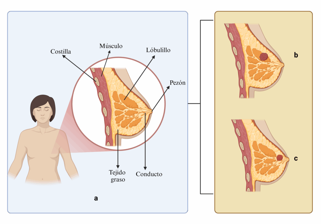 El cáncer de mama (CM) es un tipo de cáncer que se puede desarrollar en una o ambas mamas. Aunque puede afectar tanto a mujeres como a hombres, es más común en mujeres. Como en otros tipos de cáncer, las células mamarias comienzan a crecer sin control y pueden formar tumores (Figura 1).