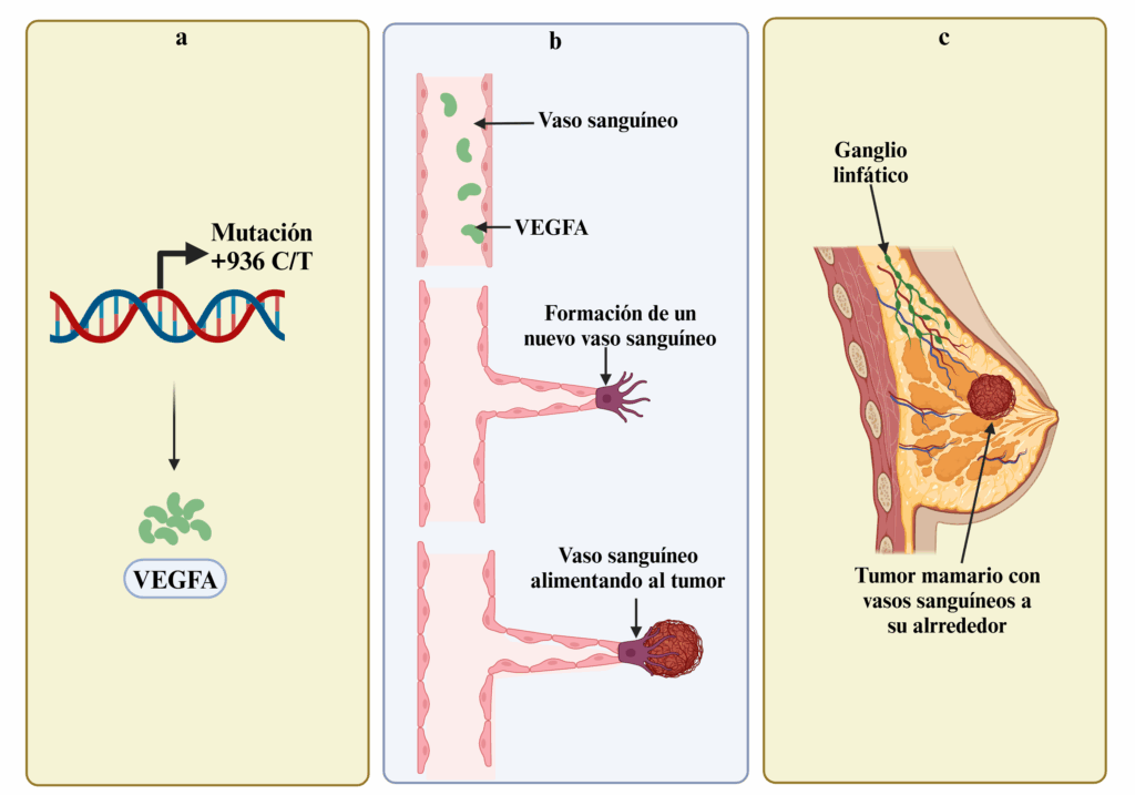En este estudio, se investigó si la mutación +936 C/T, ubicada en una región que regula la cantidad de proteína que produce el gen VEGFA (+936), está relacionada con un mayor riesgo de desarrollar CM en mujeres mexicanas. Para ello, se analizaron dos grupos: 231 mujeres con CM confirmado y 201 mujeres sanas como grupo de comparación. De las pacientes se tomaron datos clínicos como la edad, si habían pasado por la menopausia, su índice de masa corporal, el tipo de tumor, si tenían metástasis (diseminación del cáncer) y el estado de los receptores hormonales.