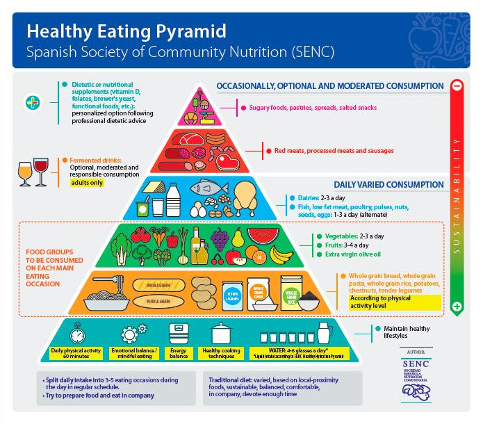 En España, la Sociedad Española de Nutrición Comunitaria (SENC) propone una guía que utiliza la representación de la pirámide alimentaria en lugar de un plato (5). La base de la pirámide se centra en la actividad física diaria y en la ingesta de agua, seguida de alimentos frescos como frutas, verduras y cereales integrales.