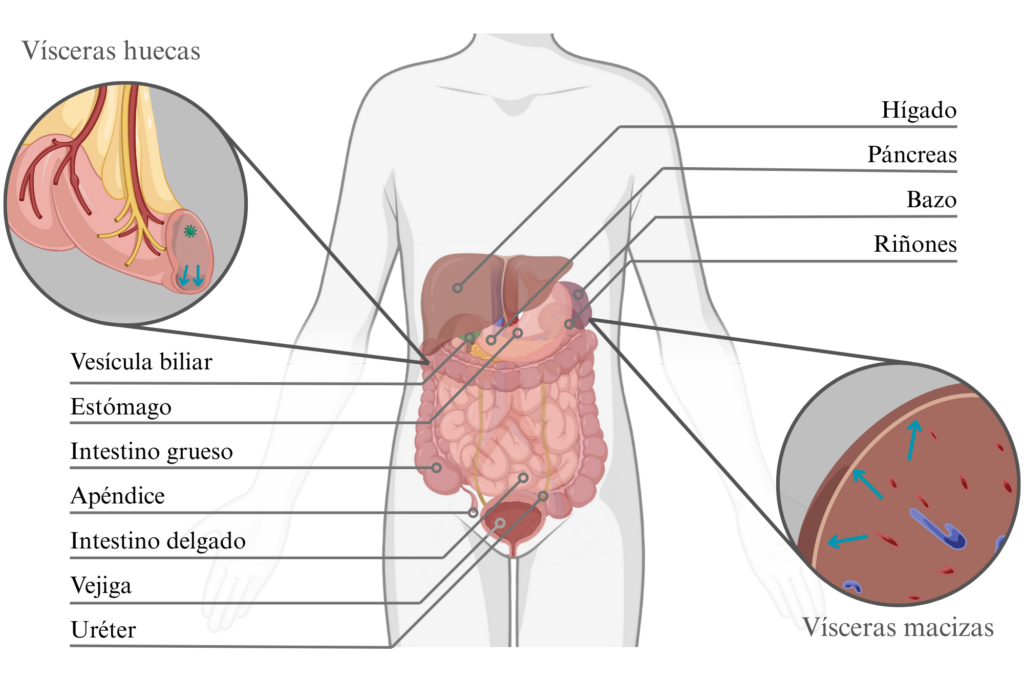 Por otro lado, las vísceras macizas carecen de receptores de dolor en su interior; sin embargo, poseen una cápsula protectora que sí tiene la capacidad de interpretar estos estímulos, pero a diferencia de las vísceras huecas, solo se activa cuando esta cápsula se estira más de lo que debería (Figura 1) [1]..